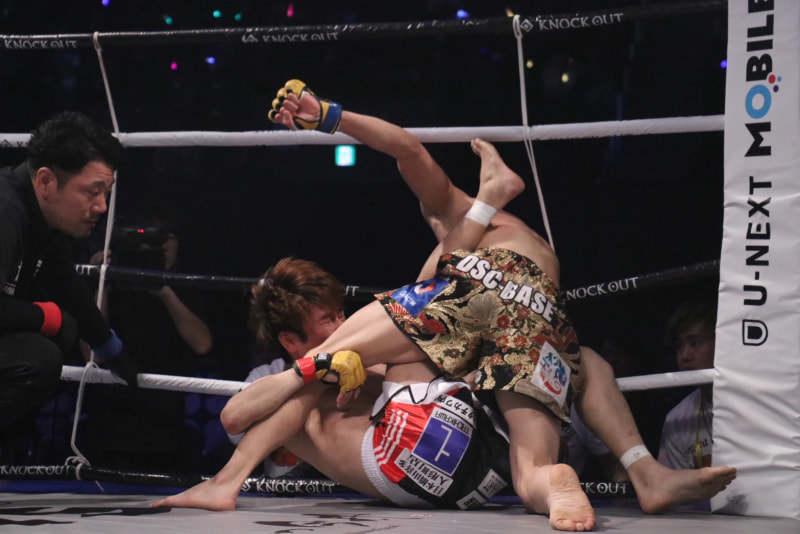新田は上からヒジ打ちを連打した
