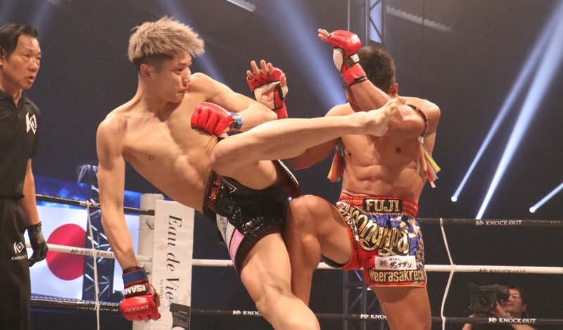 久井がキックを放つ