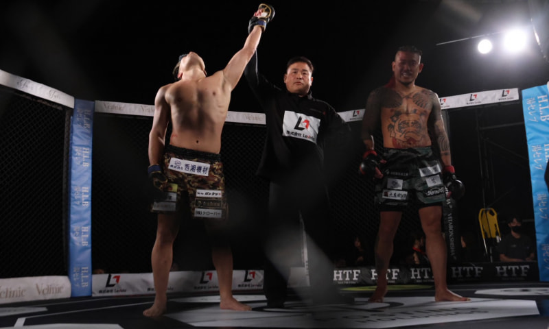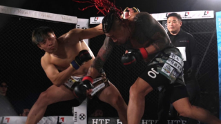 沖田は詰めて連打から顔面ヒザも。最後は沖田の猛攻に、モギは足がグラつき、ケージまで吹っ飛ばされた。ゴングが鳴ると、モギの左目上からは出血が。