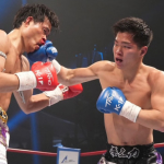 パンチを当てる橋本(右)、池田は出血も