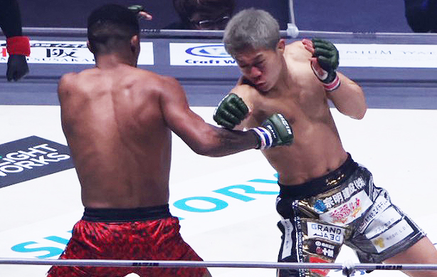 2R、ミックスが前に出ては、タックルにトライも秋元は外す。秋元のワンツー、更に左でミックスがダウン。秋元が連続でサッカーボールキック、レフェリーがストップした。