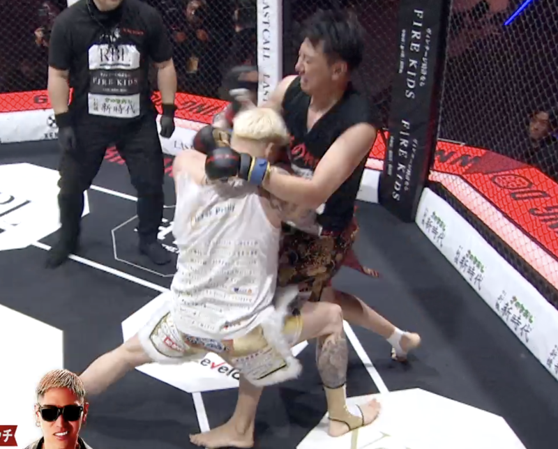 試合は、いきなり村長がスーパーマンパンチでヒット!フォームも構わず、村長が襲いかかると、右でスリップダウンを取る。さらに投げ飛ばし、まさに喧嘩のような様相だ。