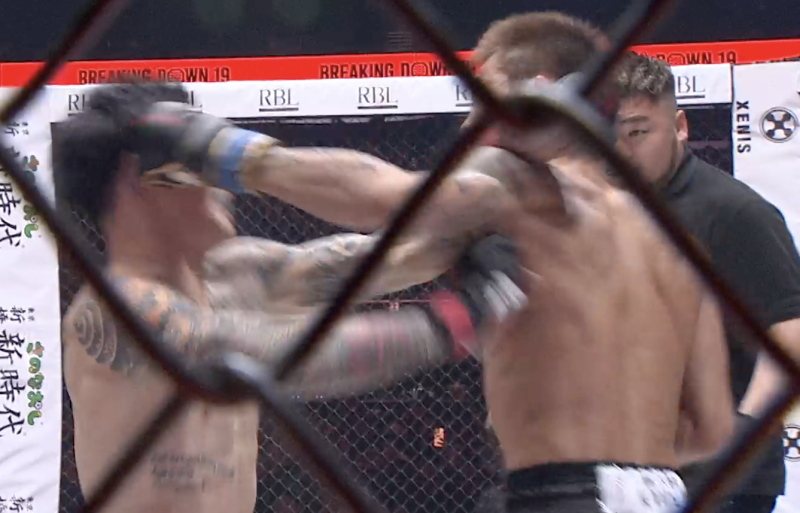 悠矢(右)のパンチがリキのテンプルにヒット!