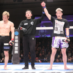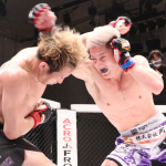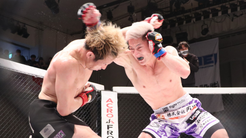 寺崎(右)と魚井のパンチが交差する