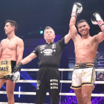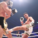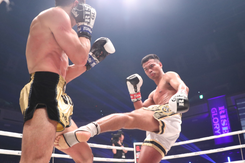 ローキックを蹴り込むペッチ