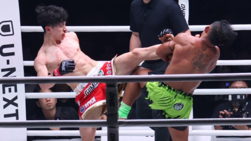 吉成が流血しながらもキックを放つ