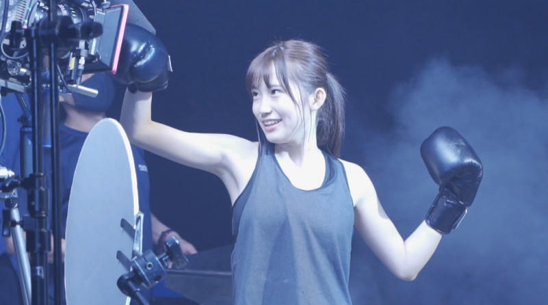 掛橋沙耶香がボクシンググローブをつけてCM撮影