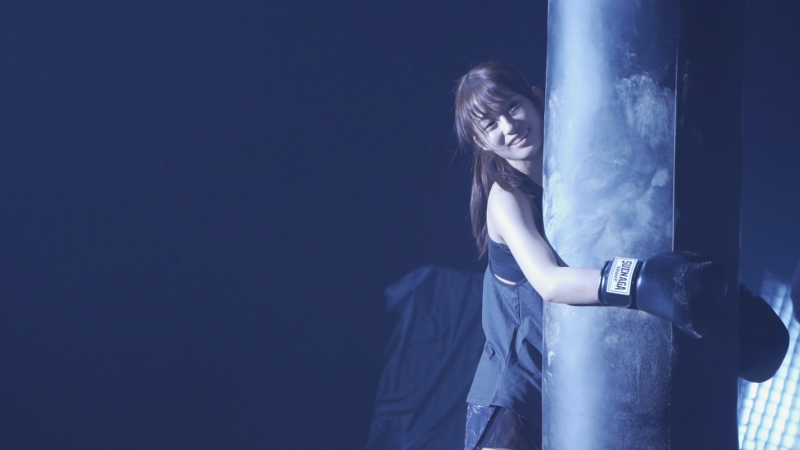 撮影の合間サンドバッグに抱きつく
