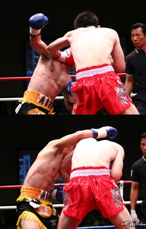 左ジャブに大月が右クロスを合わせてくると、ヤスユキは首と肩をすくめて右クロスを抑える