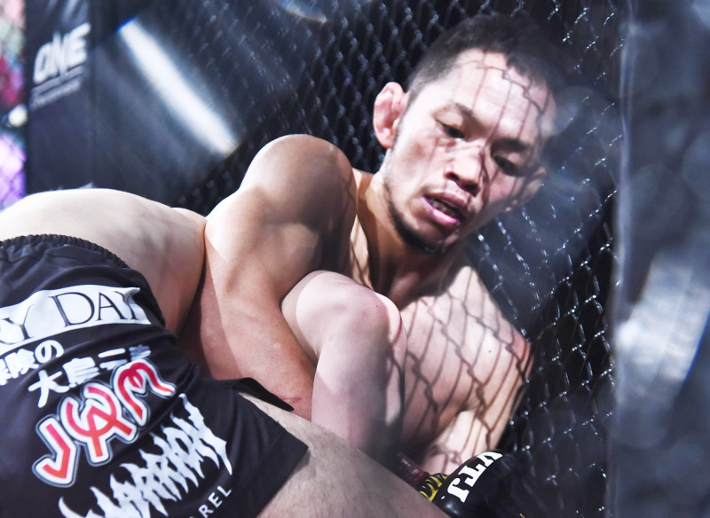 宇野が寝技を凌ぎながらもアームロックを仕掛ける