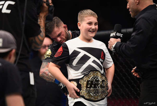 少年の腰にチャンピオンベルトを巻くコーディ。この少年とコーディの関係は… By courtesy of Zuffa LLC / Getty Images