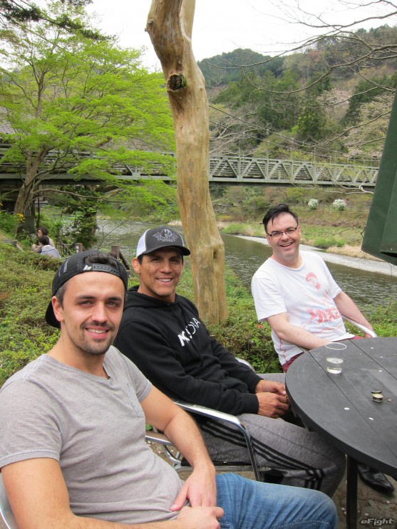 純米酒を飲んでご機嫌のフランク(中央)と実況アナウンサーのマウロ・ラナロ(右)
