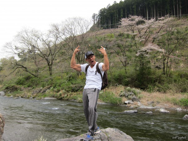 多摩川の源流近くで、始めて見る桜と清流に興奮し、絶叫するフランク