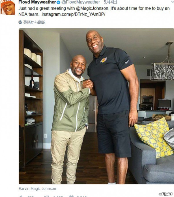 マジック・ジョンソンとの写真とともに「NBAチームを買わなきゃな」とツイートしたメイウェザー。そのためにも、マクレガー戦で稼ぎたいはずだ。