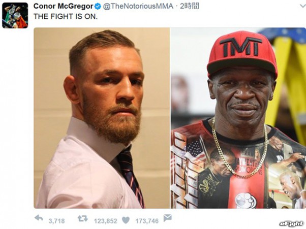 「試合が決まったぜ」とツイートしたマクレガー。 しかし、自分と、メイウェザー父の写真を載せて、メイウェザーをからかっている。