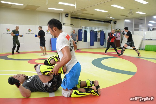 広々としたマットスペースの手前では山田(左)を相手に国本が寝技スパー、右奥では髙阪が岡見と、右奥では藤田がシビサイとスパー