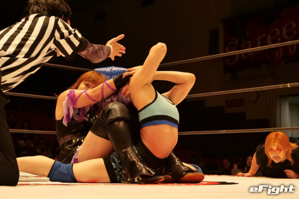 プロレスは5月にデビューしたばかり。攻め込まれるマドレーヌに井上京子(右下)がセコンドで檄を飛ばす